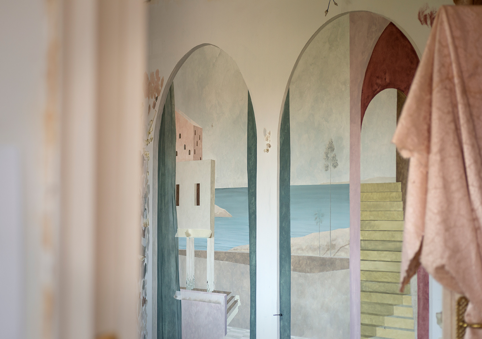 The image of the ephemeral exhibition ESTADO REAL was intended to generate expectation around the artistic intervention of the architect and muralist Elvira Solana, as well as the production of a series of printed pieces such as posters, invitations and explanatory room sheets. The work consisted in the relocation of a luxury home in Madrid from a series of murals painted on its walls, which showed the views of its new seaside and fictional site.