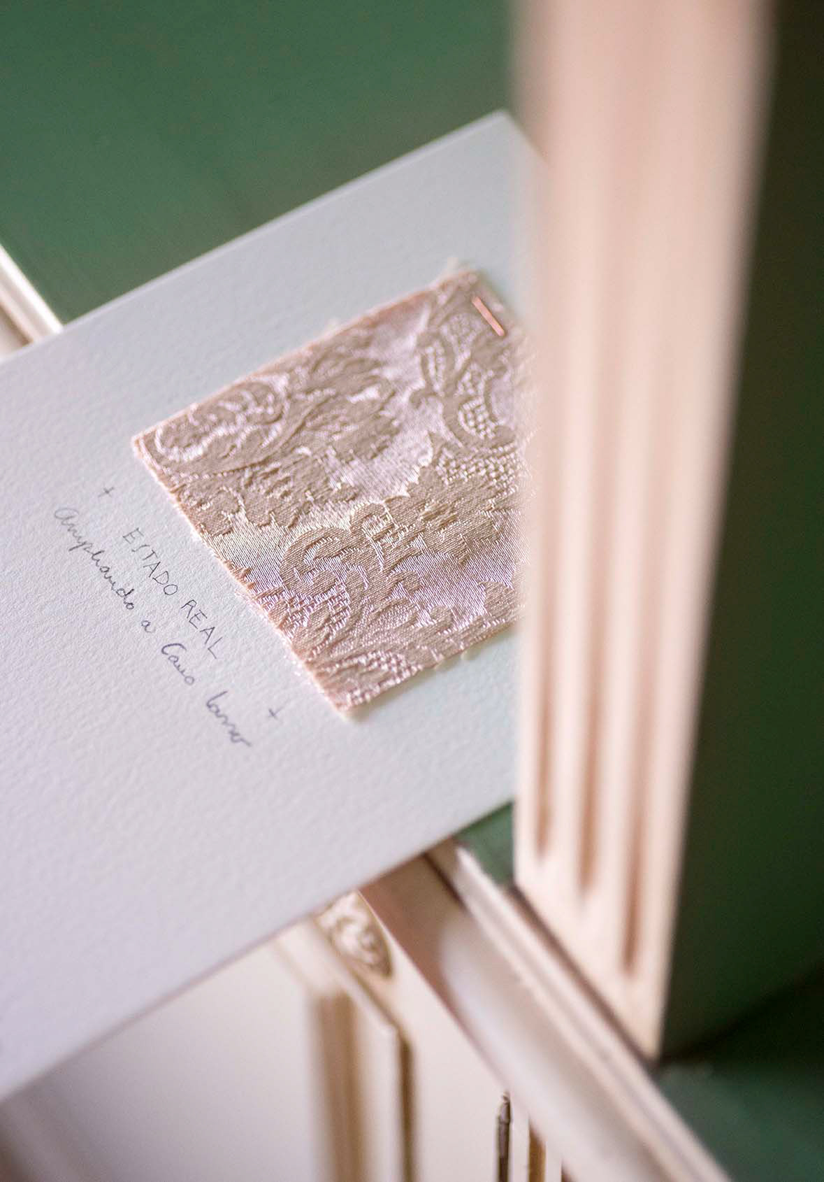 With the aim of enhancing the dialogue between painting and architecture, I chose two complementary typographies that represented the traditional pictorial world and the avant-garde technical universe, respectively. The palette of colored papers represent the pigments used in the murals. The invitations included a piece of cloth resulting from the process of uncovering the walls of the house, previously covered.